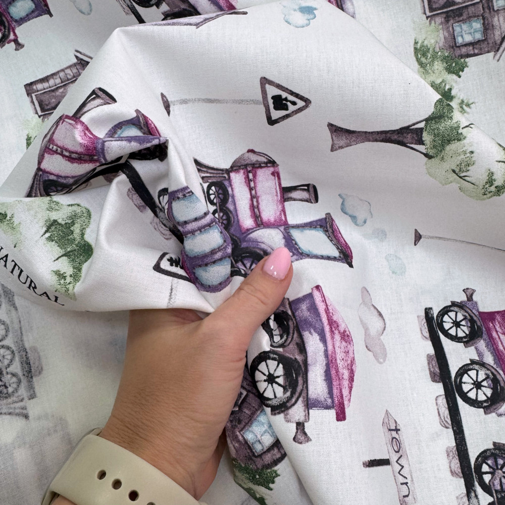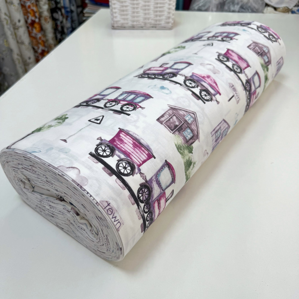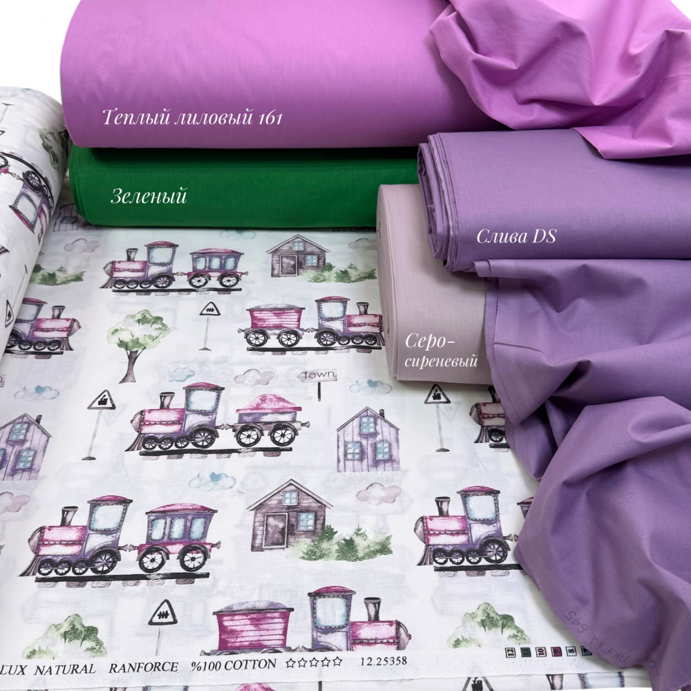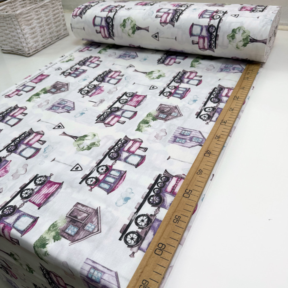 Ранфорс с рисунком-паровозики-домики сиреневые